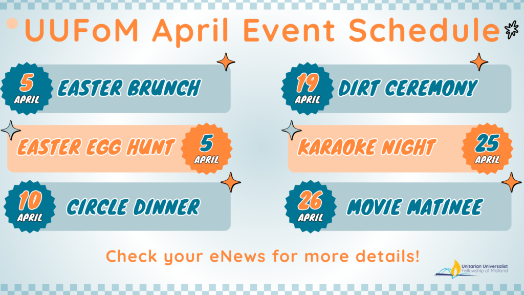 Join us for an intergenerational service celebrating Earth Day, followed by a dirt ceremony and other activities. Led by Rev. Eric Severson.